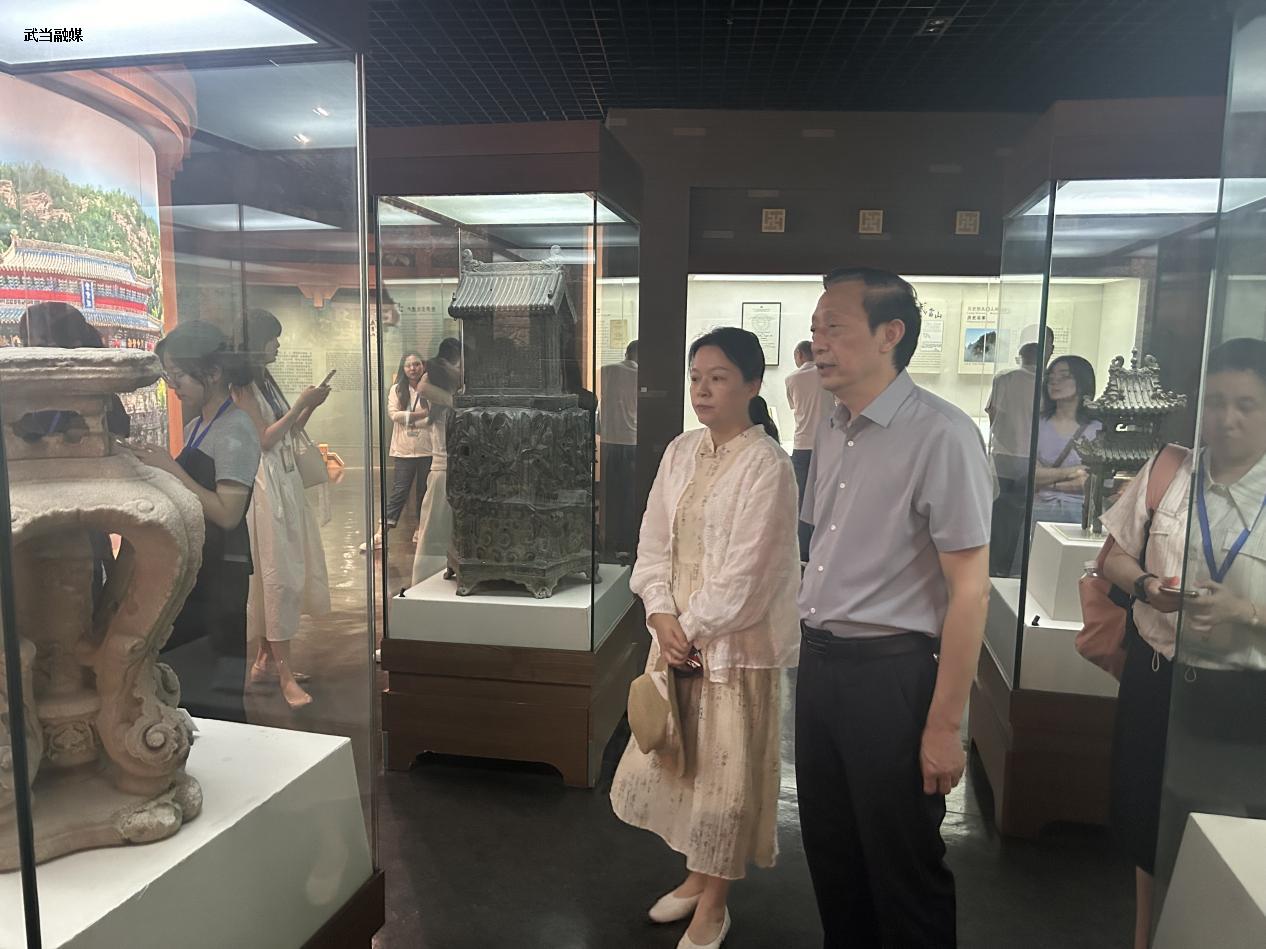 在讲解员引领下,嘉宾们深入了解了武当文化的独特魅力。从武当建筑艺术的精妙绝伦,到仙山名人的传奇故事;从道教简史的博大精深,到道教造像的匠心独运;从宫观道乐的悠扬韵律,到武当武术的刚柔并济,再到香俗文化的深厚底蕴,每一件展品都仿佛在诉说着武当山的历史与文化。