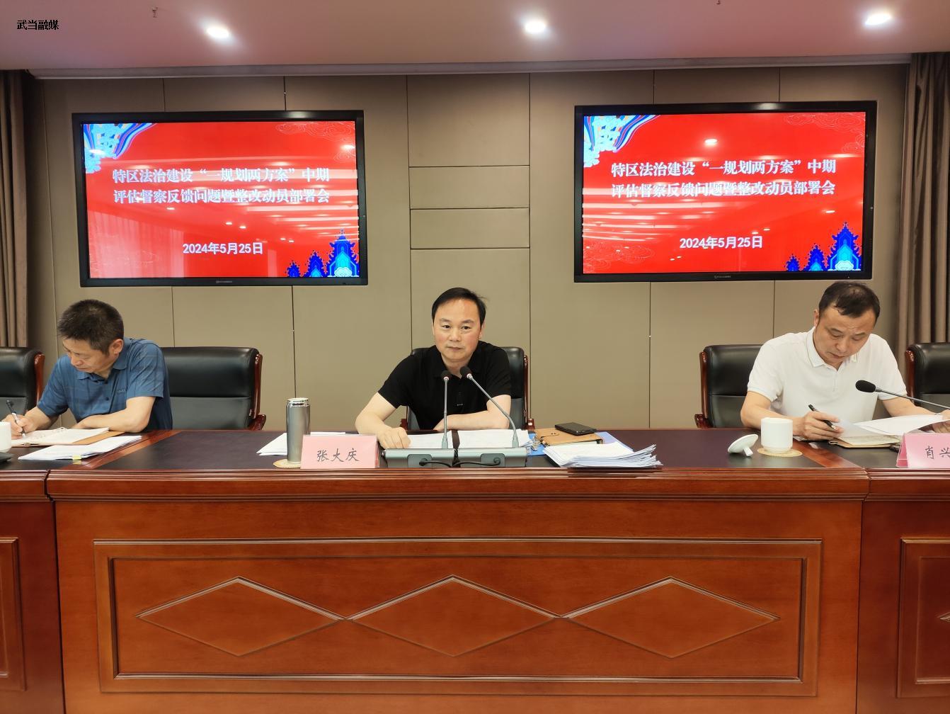 (通讯员 龚金 韩峰)5月27日,武当山特区落实十堰市法治建设“一规划两方案”法治督察反馈问题整改交办会召开。特区党工委副书记、政法委书记、全面依法治区委员会副主任、依法治区委员会办公室主任张大庆参加会议并讲话,区直各相关单位负责人参加会议。