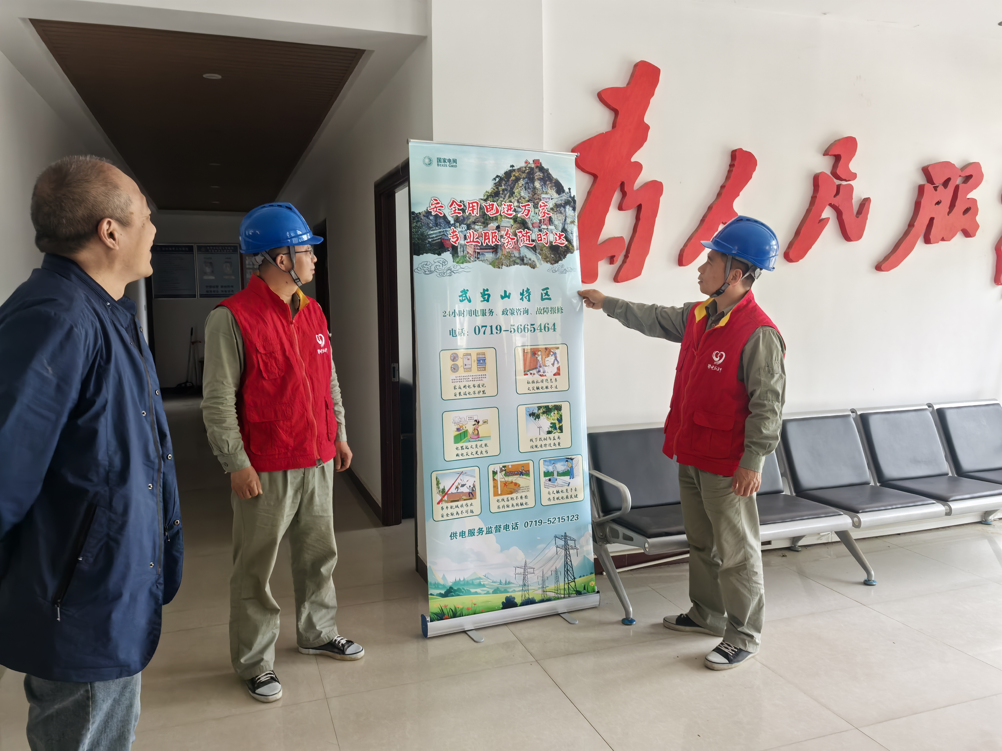 (武当融媒记者 汪伟 通讯员 乔会琴 张文会 )4月28日,国网丹江口市供电公司武当山供电所“南水北调”共产党员服务小分队穿梭在辖区各个村委会之间,将印有24小时用电服务、政策咨询、故障报修电话、日常安全用电常识以及供电服务监督电话的易拉宝和摆台,放置在各村委会大厅显眼位置,为村民们提供便捷的电力服务指引。