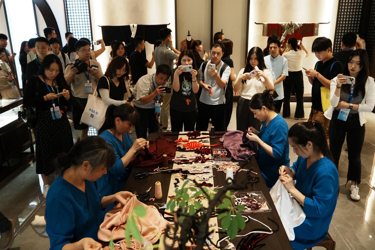 在武当秀华道源服饰有限公司,采访团走进传统服饰展厅、裁剪房、制衣车间、盘扣车间、非遗馆,详细了解企业如何将武当文化元素创新应用于现代服饰设计、市场推广策略、品牌建设、文旅消费市场拓展以及带动当地就业等方面的创新做法。大家被企业在武当文化的传承和创新转化的成果所深深吸引。