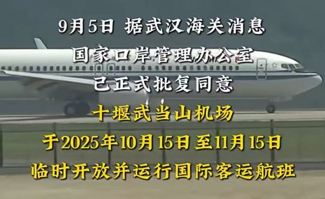 近日,国家口岸管理办公室正式批复同意:十堰武当山机场于2025年10月15日至11月15日临时开放并运行国际客运航班。这是继2024年后武当山机场第二次临时开放国际航线,不仅执行时间进一步延长,还计划新增多条国际及地区航线,为武当山旅游市场国际化发展注入强劲新动能。