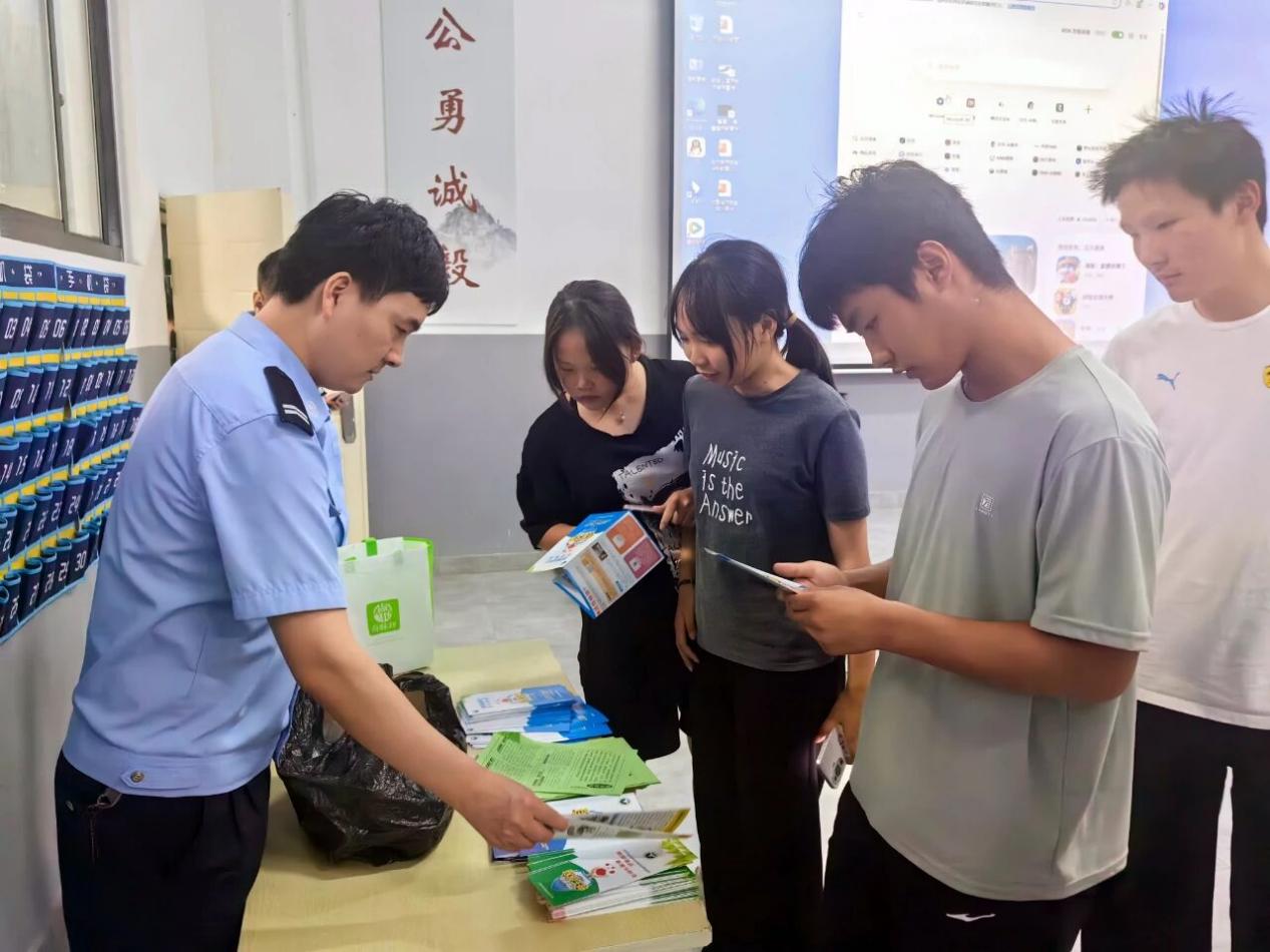 禁毒教育环节,民警阐明禁毒工作重要性,通过图文展示、播放《毒魇》宣传片,用真实案例揭示毒品对个人、家庭的危害。活动现场设置宣传展台,展出“冰毒”“笑气”“上头烟油”等新型仿真毒品模型,民警引导学生近距离观察其伪装形态,普及毒品辨识方法与社会危害。