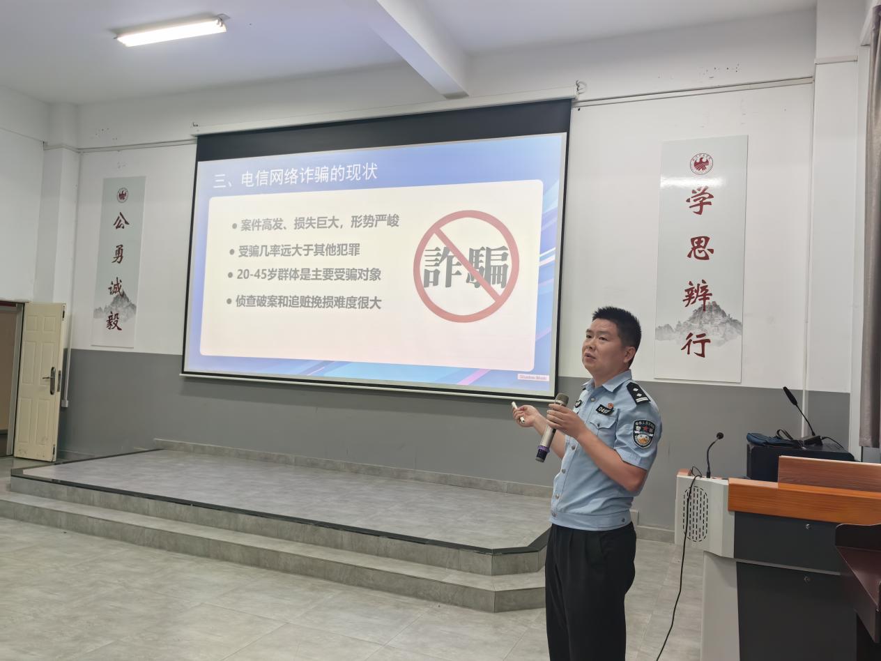 9月16日,十堰市公安局武当山特区分局组织民警走进武汉体育学院武当山国际武术学院,开展“禁毒、反诈、校园安全”主题宣传教育活动,为200余名大一新生送上了一堂法制宣传教育课,切实增强大学生法治意识与安全防范能力。