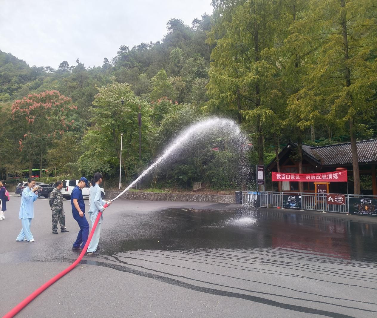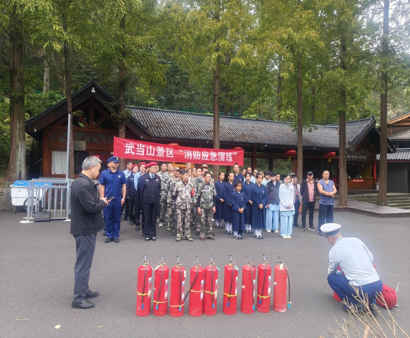 9月25日下午,武当山景区办事处在逍遥谷开展消防应急演练活动,特邀武当山消防救援大队现场指导。景区护林防火大队、综合执法大队、环卫所以及辖区内商户代表、武馆院校等共同参与。