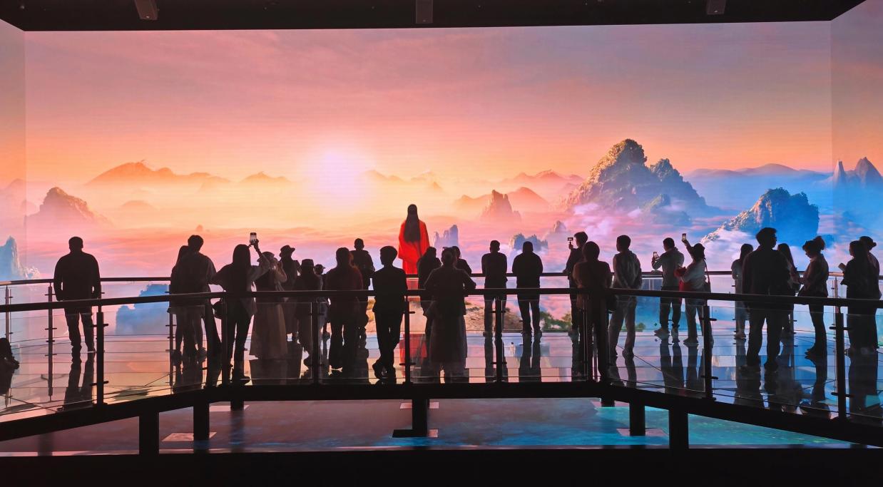 在数字客厅,游客们驻足在CAVE影厅道乐传统乐器寻宝、太极十三式互动体验、万物有灵-数字山水灵瑞《自然生长》等多主题中,沉浸式深度文化体验,全方位感受全景武当,尽情享受视觉盛宴。