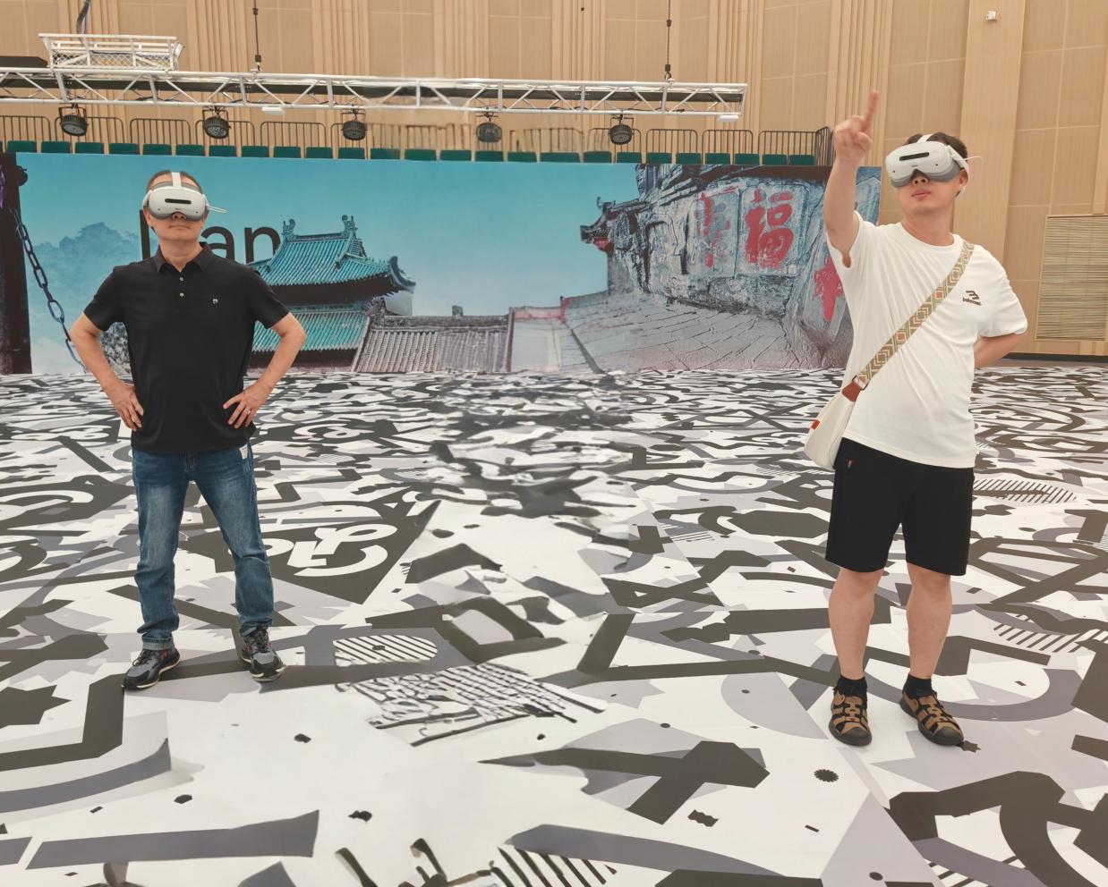 在“武当一梦”园区,游客戴上 VR眼镜,眼前呈现出一个不一样的武当。俯瞰“天造玄武”胜境、探秘五龙井玄机、观看“一柱十二梁”建造传奇、目睹传说中的雷火炼殿…在《入境武当》VR大空间现场,记者看到,游客戴着 VR设备,在虚拟导游玄淼淼、武焱焱的引导下,踏上穿越之旅,他们时而仰头惊叹,时而俯身探察,在这一过程中,游客可以根据场景设置作出不同动作,比如习武、祈福、弯腰、跨步等,以解锁下一步的场景,沉浸体验这一超大型虚实共生 VR山岳史诗。