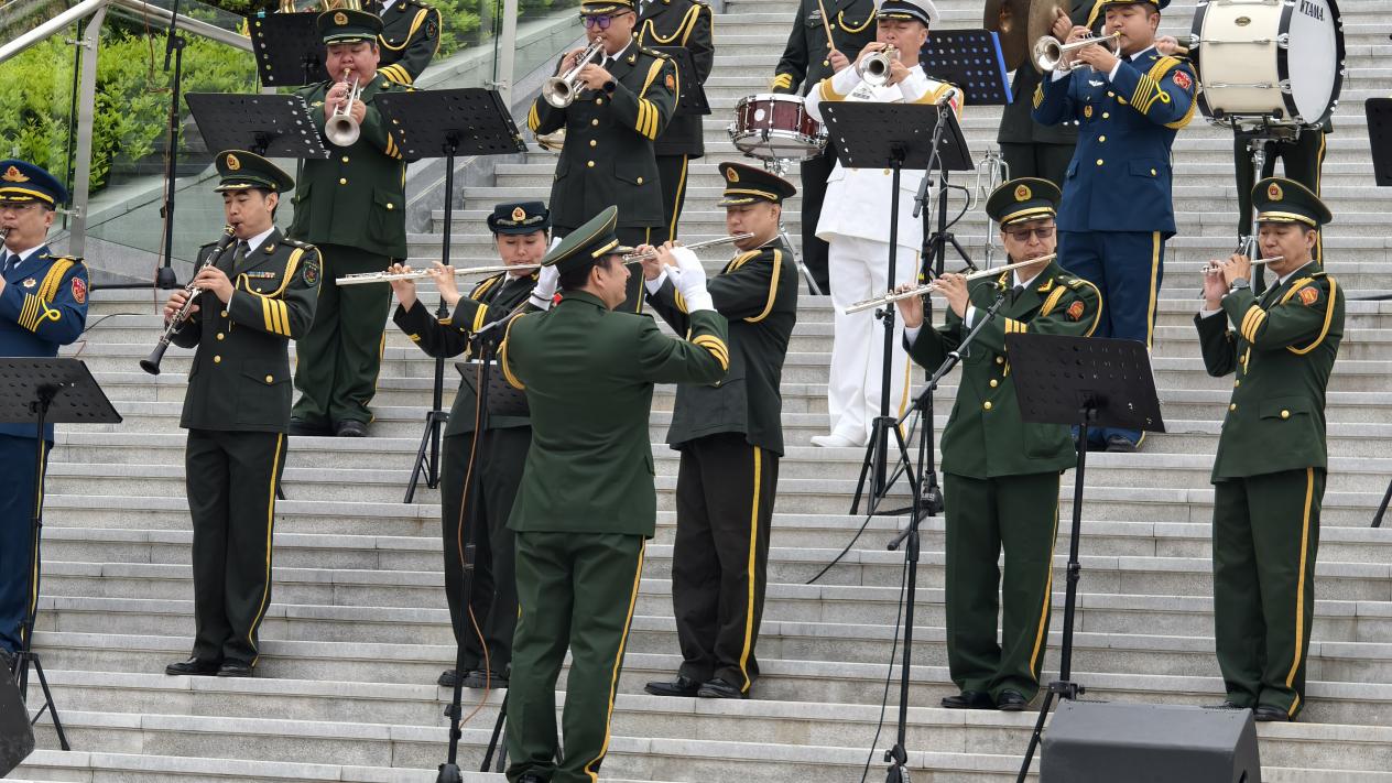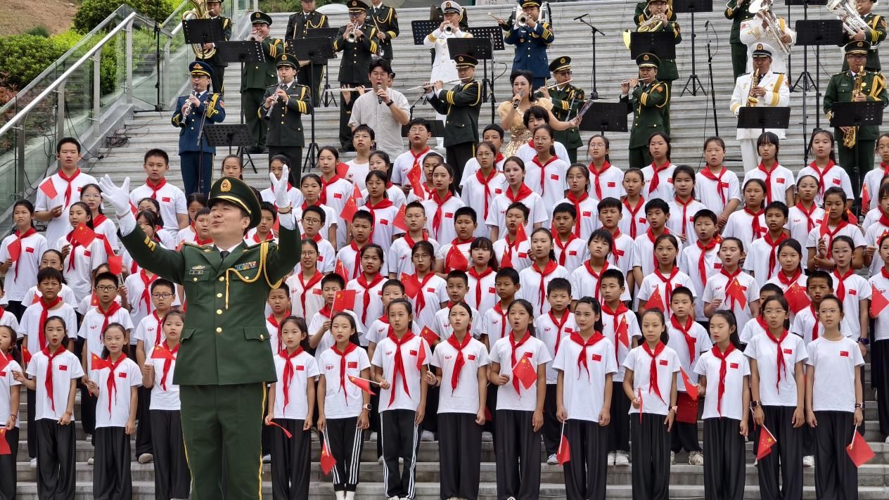 11时许,水幕台阶前响起庄严军乐。老战友联合军乐团与本地中小学生合唱团联袂献唱《我和我的祖国》《保卫黄河》等经典曲目,游客自发加入合唱,手中挥舞的国旗汇成红色海洋,爱国热情与山河美景交相辉映。