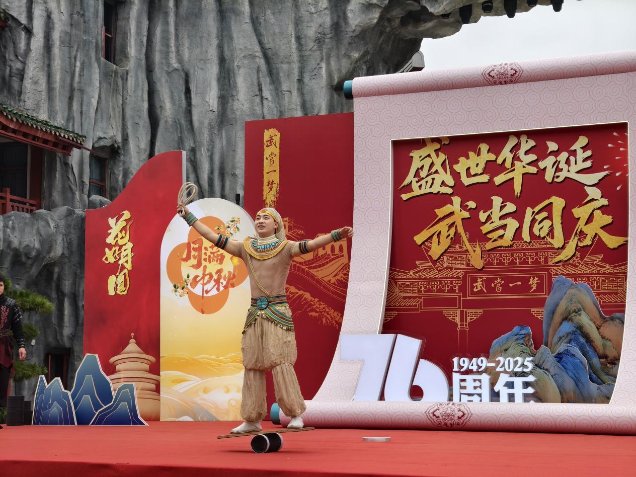 当日上午10时,《仙界迎宾》乐声响起,游客有序入园。西安战士战旗杂技团带来的《坛·承》《浮管承艺》率先开演,顶坛旋转、晃管等惊险动作瞬间点燃现场气氛。随后,肩上芭蕾、抖杠、单杆等杂技表演,在《大话武当》剧场和商街戏台全天候上演。