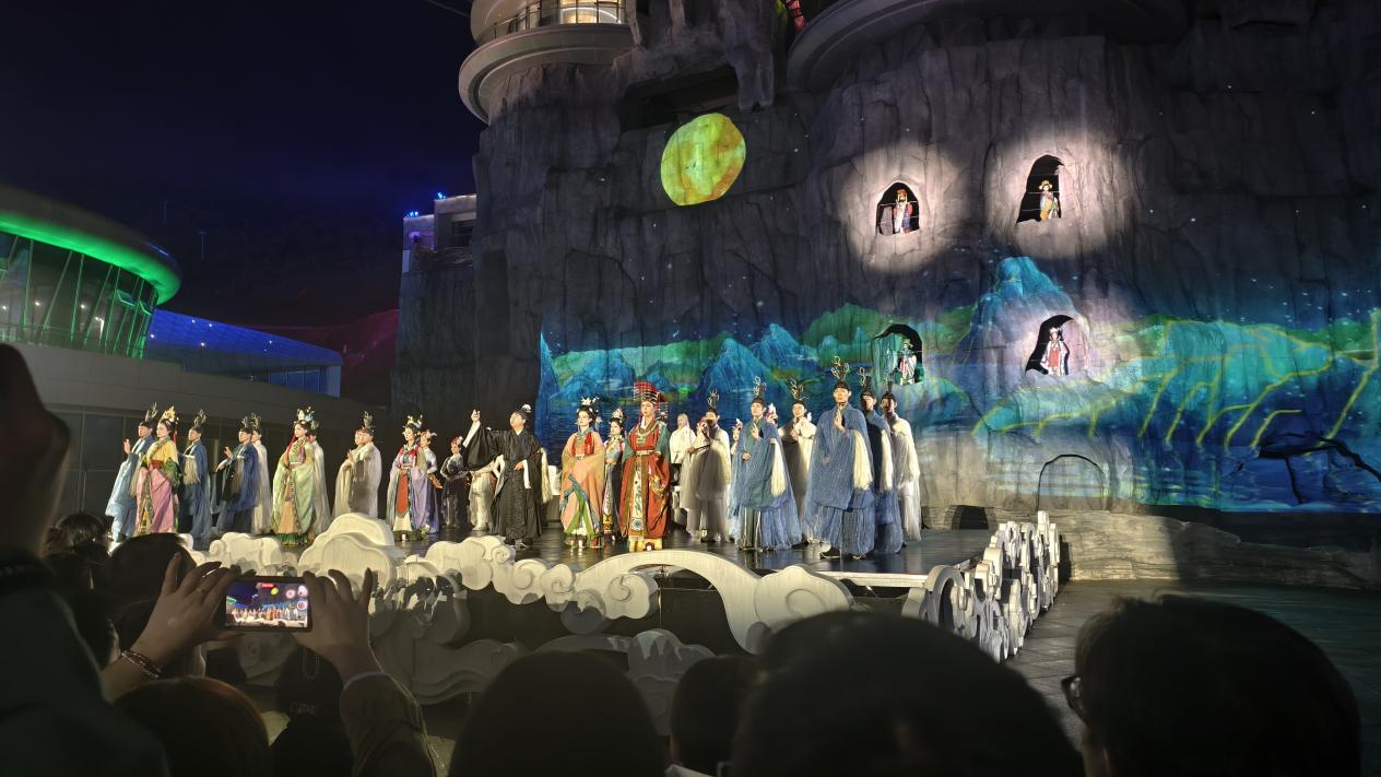 夜幕降临,崖壁舞台举行拜月活动,非遗铁花同步绽放。游客跟随仪式寄托美好祈愿。不少游客表示:“每天40场演出看不完,明天还要来。”
