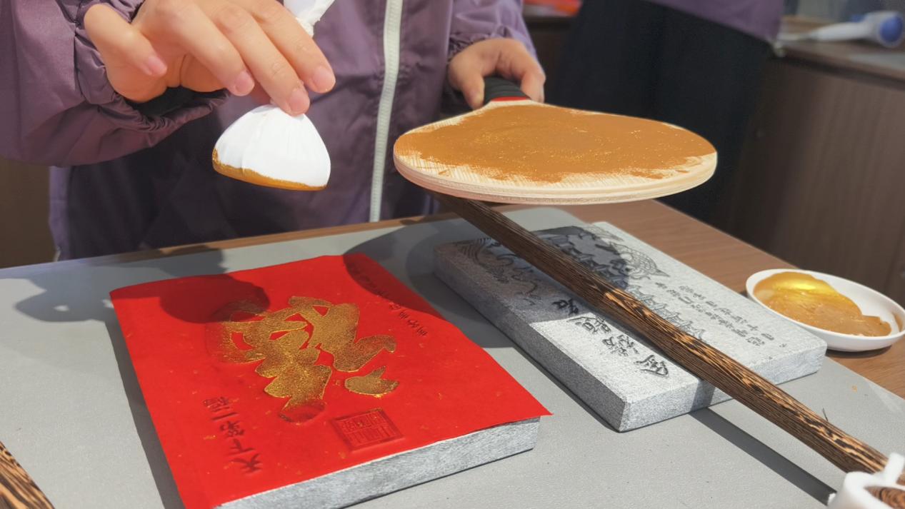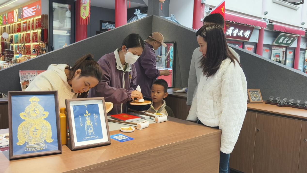 更值得关注的是,今年武当文创还新增了“沉浸式体验”玩法,让游客从“买文创”变成“做文创”。在武当玄物集银街店文创体验区,设置了非遗手工拓印体验项目,游客可在工作人员指导下,用非遗拓印的手法,把武当山的福气拓回家。