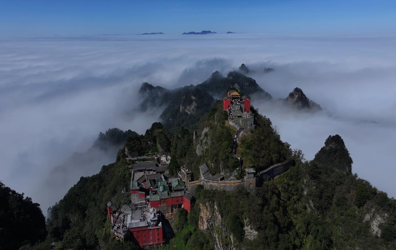 “十一”黄金周期间,武当山大部分时间被阴雨笼罩,给游客行程带来些许遗憾。10月7日,尽管山路上依然是细雨绵绵,但是登上天柱峰却惊喜降临。当游客们乘坐缆车穿破云层时,眼前的景象豁然开朗。云层之上,天空湛蓝,阳光灿烂,温暖地洒在古老的宫殿和红墙金顶之上,熠熠生辉。立于金顶,山间浓雾升腾,在群峰间翻涌流动,山峰与树木笼罩其中,若隐若现,如梦似幻。俯瞰脚下是奔腾的云海,仰望头顶是湛蓝的苍穹,仿佛置身于天宫琼楼,真正体验到了“会当凌绝顶,一览众山小”的壮志豪情。