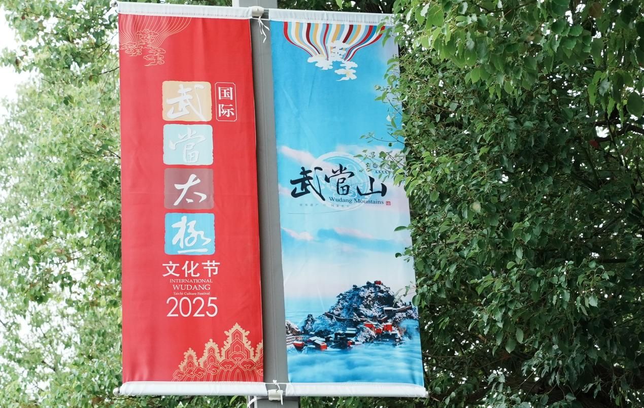 “整个道旗共有400组800面,上面分别绘制着‘2025国际武当太极文化节’的标语与武当山金顶图案。”武当山特区路灯与河道管理所负责人沈元泽介绍:“800面道旗将分别悬挂在太极湖东路、武当路、太极湖延伸段。10月10日起开始道旗悬挂工作,预计10月14日全部结束。”