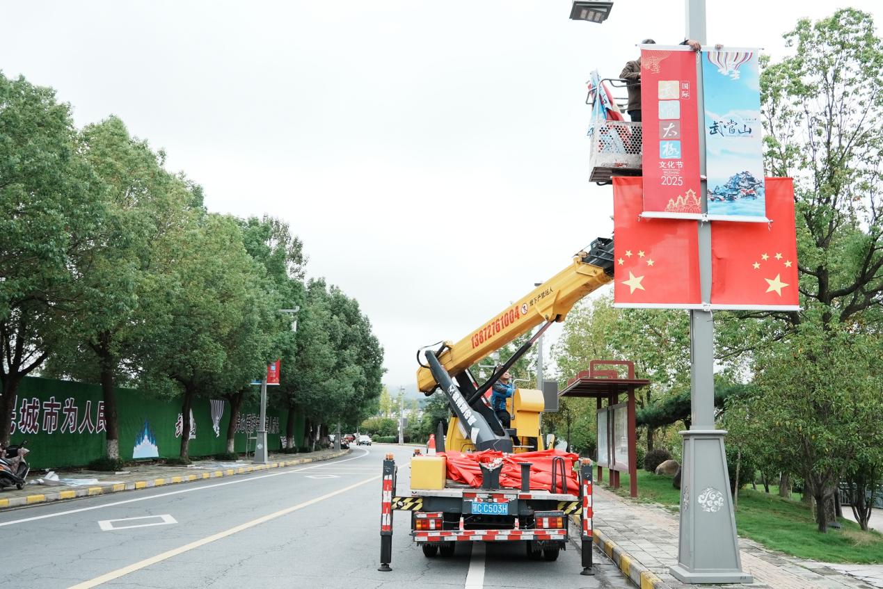 10月11日上午,记者分别在武当路和太极湖新区主干道看到,工人师傅们正在加紧对路灯杆上的道旗进行更换,一组组洋溢着太极文化节元素和武当美景的道旗,形成了一道流动的文化风景线。