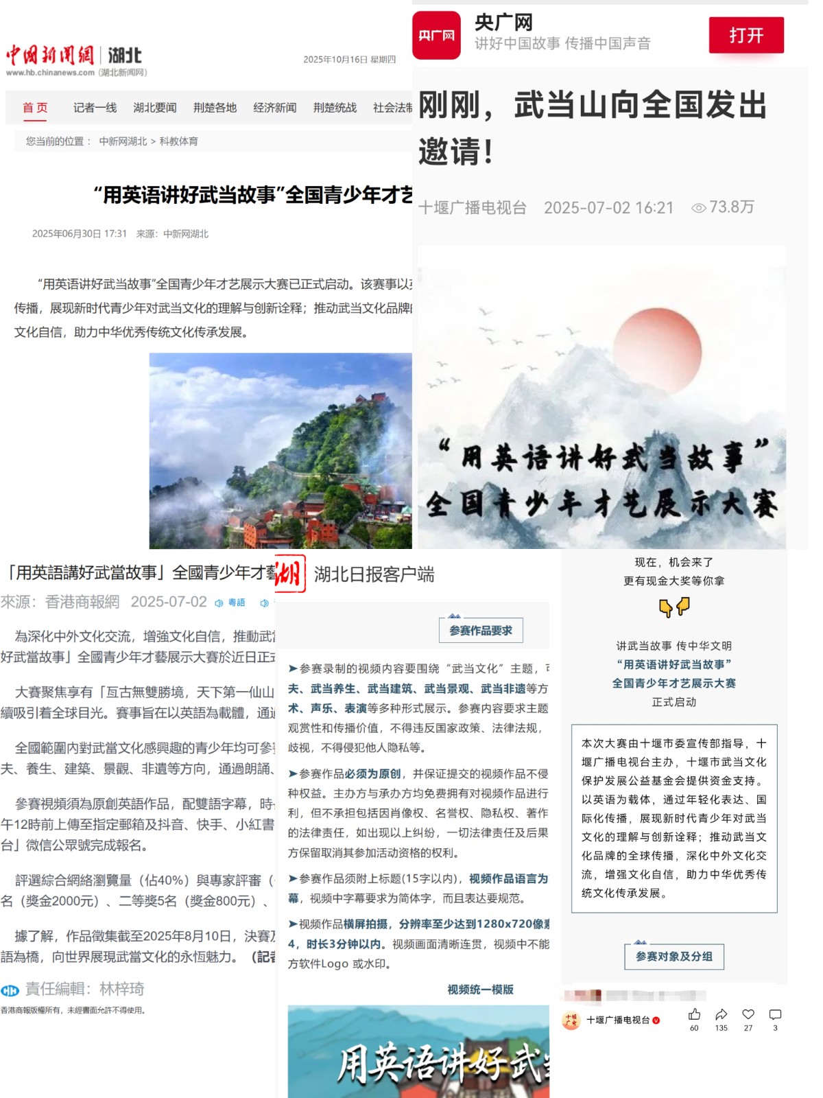 为深入贯彻党的二十大精神,服务湖北省“支点建设”战略布局,扛牢“湖北旅游·武当突破”重大历史使命,在十堰市委宣传部指导下,十堰广播电视台联合十堰市武当文化保护发展公益基金会、武当山旅游经济特区融媒体中心,共同举办“用英语讲好武当故事”全国青少年才艺展示大赛。