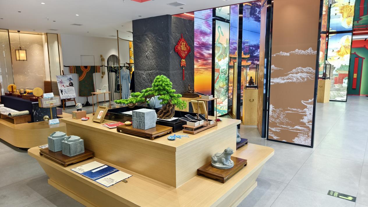 在武当文创非遗展厅,鸡血玉展品、篆刻作品、武当传统文化服饰、武当道茶、武当养生产品、旅游文创产品等品类众多的文创作品琳琅满目、摆放有序。既展现了十堰传统文化的深厚底蕴和丰富的文旅资源,又体现了当代艺术家们的创新精神和当代艺术的独特魅力。