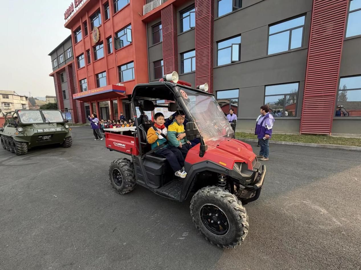 孩子们还饶有兴趣地体验乘坐了“三猫”全地形车,并通过讲解了解了该车辆在山地、水域等复杂环境中的救援功能与出警流程。活动通过现场观摩、互动体验等方式,将消防安全知识转化为生动实践,进一步加深了幼儿对消防工作的认识与尊重。