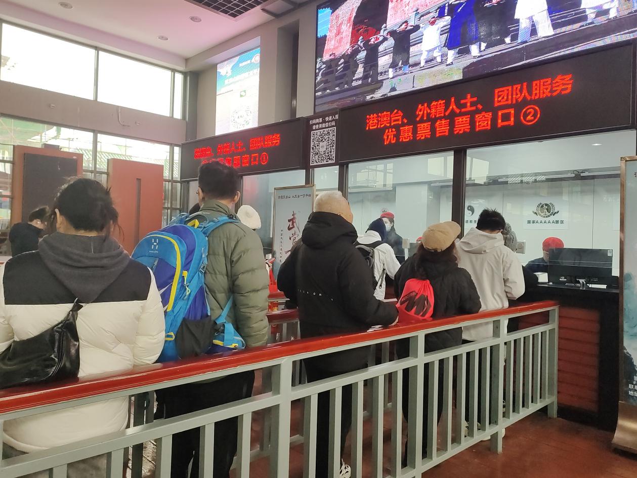 在景区游客服务中心入口,一大早便排起长队,游客们有序入园,迫不及待奔赴各核心景点,感受武当山的人文魅力与新年气息。