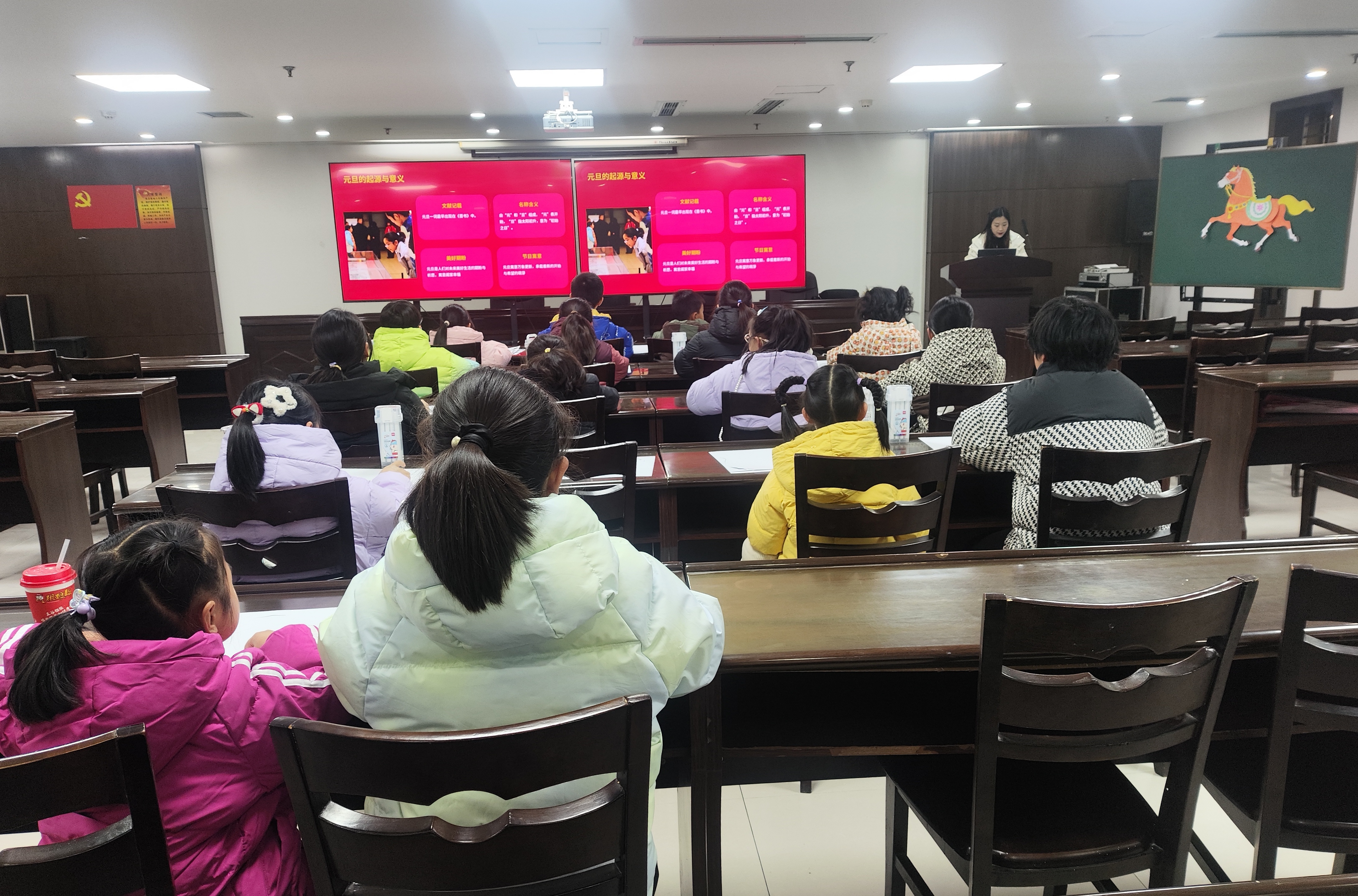 活动分为文化讲堂与巧手彩绘两个环节。在文化讲堂中,博物馆社教老师为孩子们讲述了“元旦”这一节日的历史渊源与变迁,阐释其中蕴含的文化内涵,并介绍了马在中国传统文化中的象征意义,激发了孩子们浓厚创造兴趣。