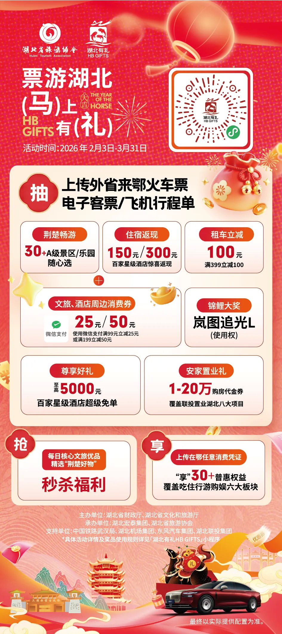 由湖北省财政厅、湖北省文化和旅游厅主办,湖北宏泰集团、湖北省旅游协会承办的"票游湖北'马'上有礼"活动将于2月3日零点在全省正式启动。“抽”大礼包、“享”普惠权益、“抢”秒杀福利三大礼遇重磅来袭,邀您“一票畅享荆楚年”。