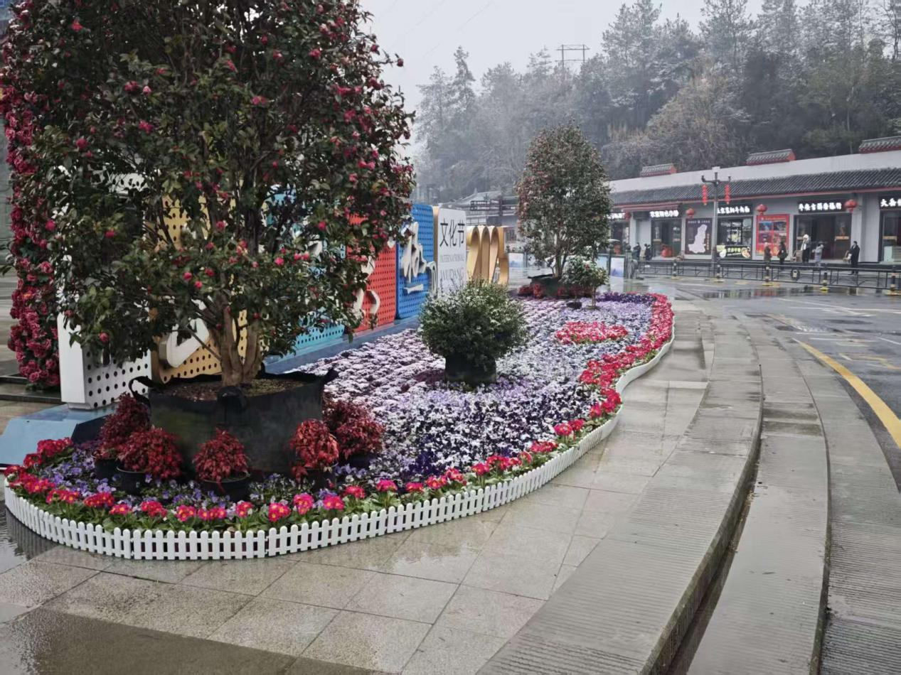 在高速出口、景区山门口、文化广场、憩园等重点区域,园林部门精心布置时令鲜花造型,选用耐寒易养、色彩艳丽的报春花、橄榄、角堇、茶梅株、茶花、火焰蓝天竹等花卉绿植约1.78万盆。通过组团式摆放、流线型布局,形成层次丰富、色彩明快的节日景观,让市民出门见景、步步生春。