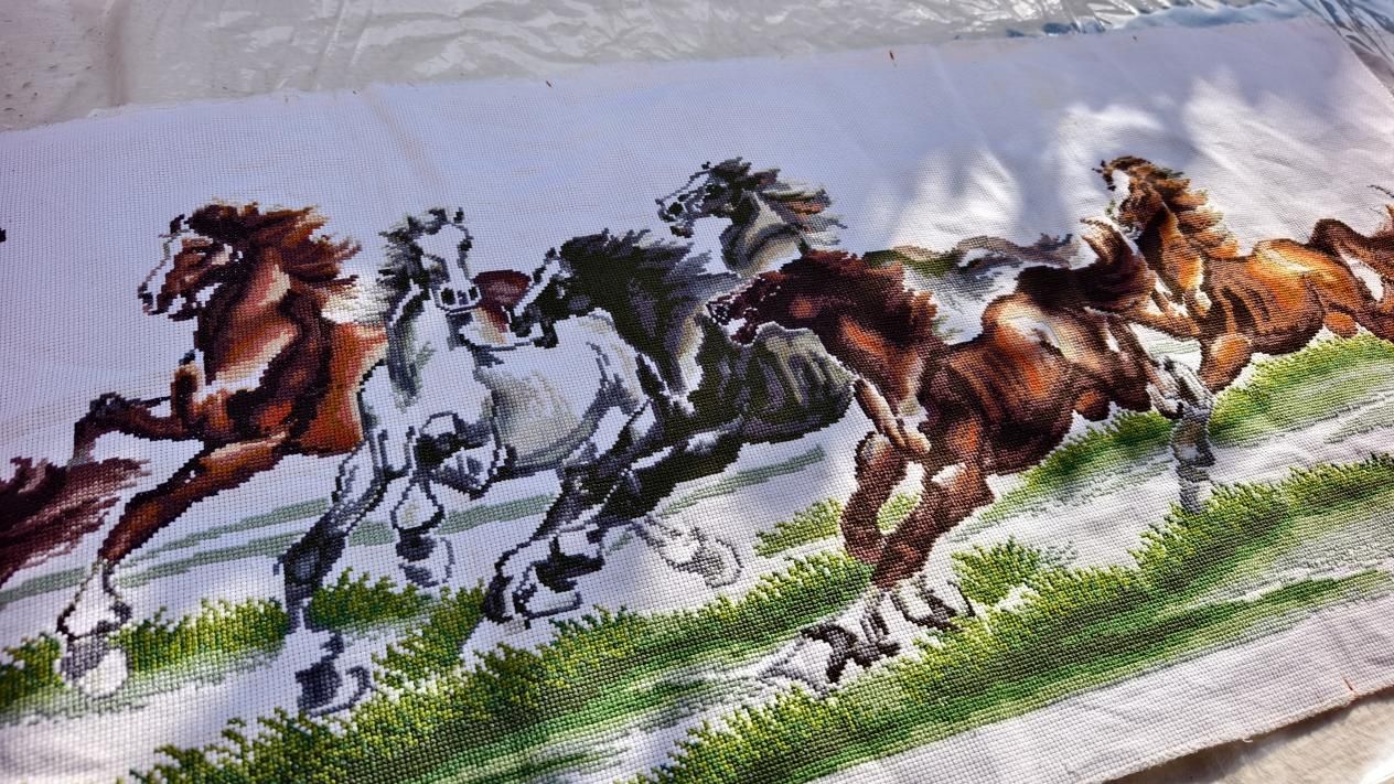 《八骏图》长2米、宽0.7米,在素色棉麻底布上,八匹神驹或昂首嘶鸣或奋蹄疾驰或缓步踏云,姿态各异。为还原马的劲健线条与鬃毛的飘逸质感,祝吉珍沿用了武当传统道服制作中的衔针、缲针等古法针法,选用46种渐变丝线,通过十字交叠的精密绣制,既展现了非遗技艺的包容性,也印证了她“传统技艺要在守正创新中活起来”的创作理念。