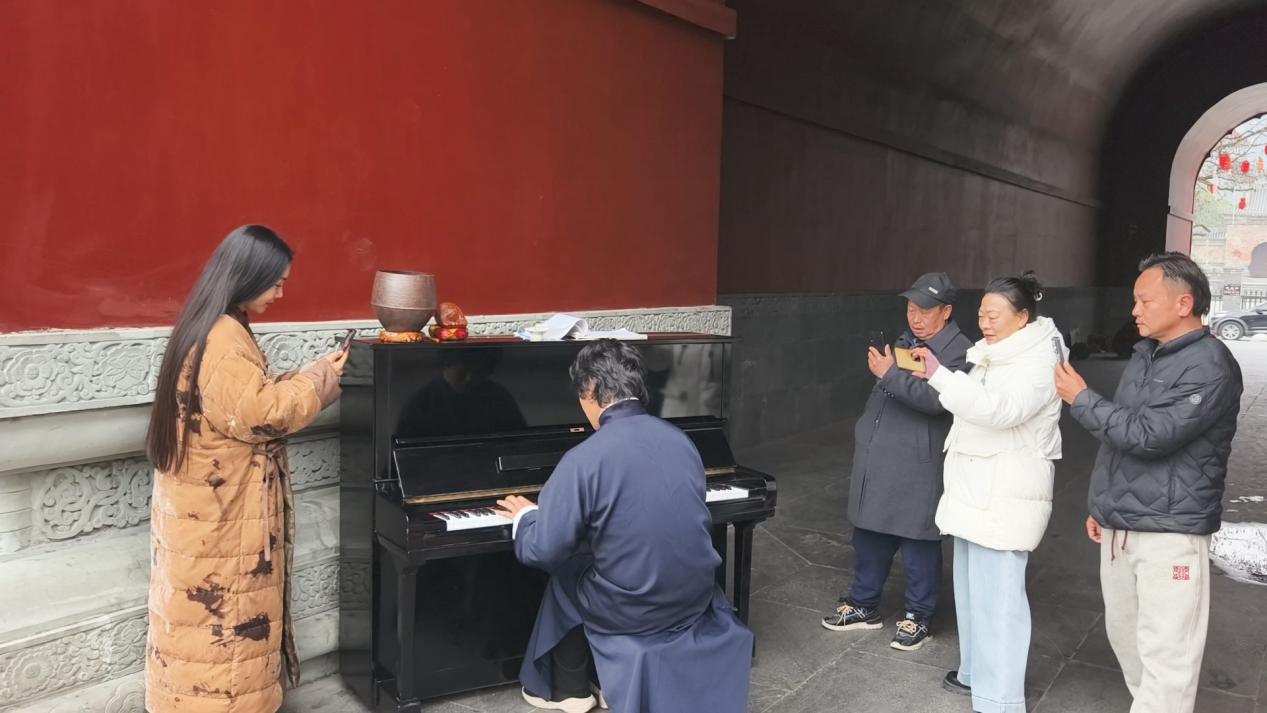 武当山音乐家协会主席王士卫在玉虚宫弹钢琴迎新春。(武当融媒记者 周容翼 摄)