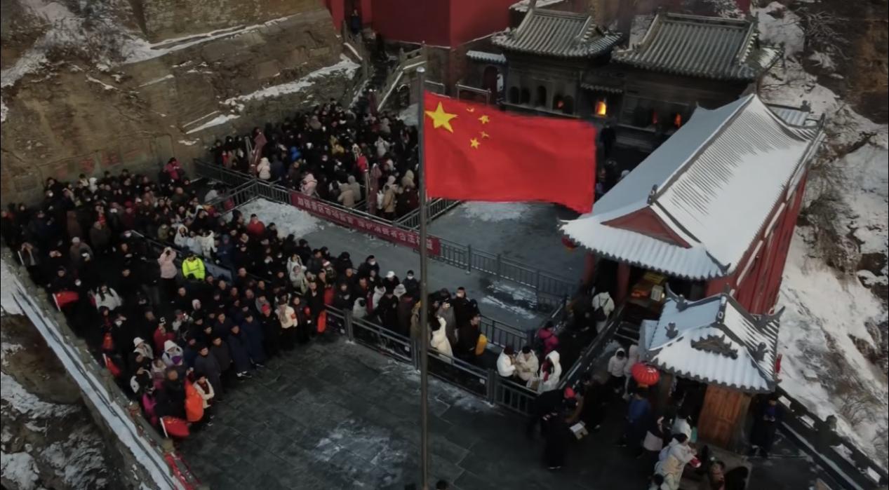 游客与工作人员在金顶小道场一同参与升国旗。(通讯员 屈剑平 摄)