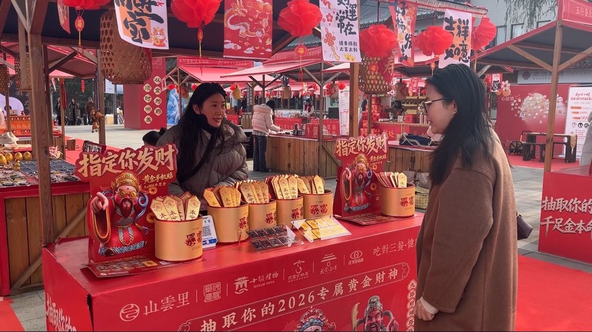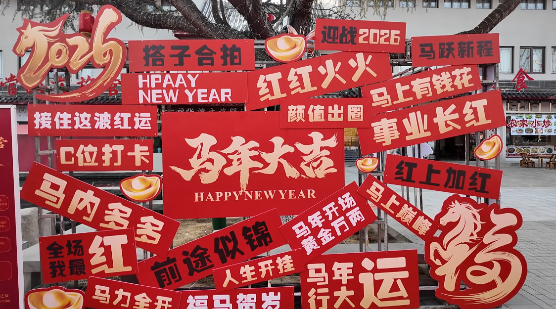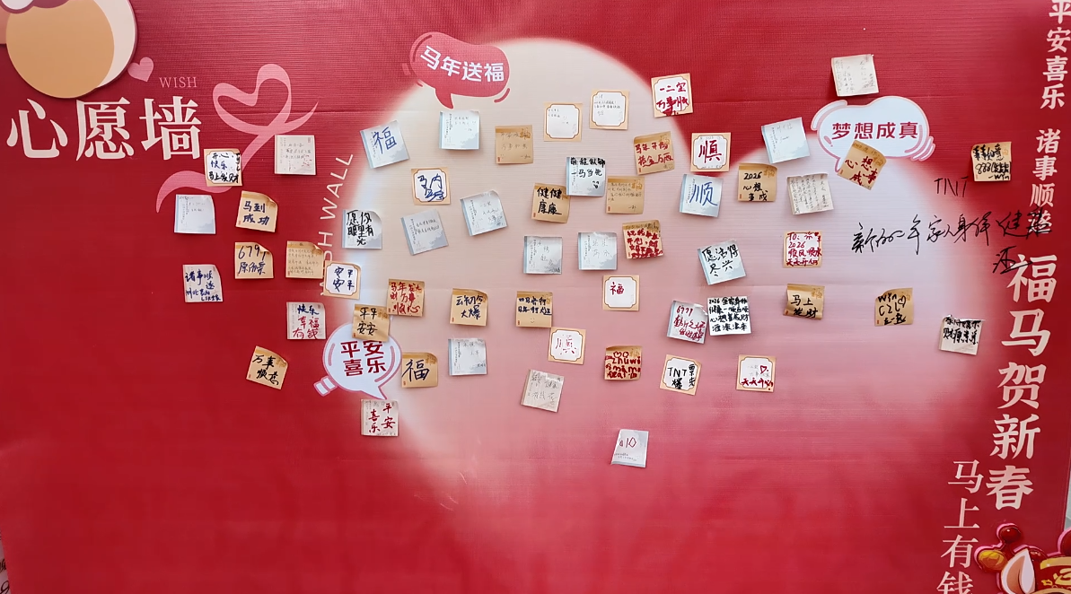 纳福文化区内年味十足,五行主题打卡点造型别致,成为游客拍照留念的热门地标。非遗手作体验区里,游客们在手工艺人指导下制作古法香囊、五行手串,感受传统技艺的魅力。祈福墙和许愿树上挂满了游客写下的新年心愿,“健康”“平安”“吉祥”等美好祝福随风摇曳,寄托着人们对新一年的期盼。