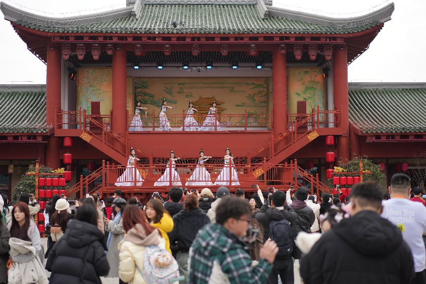 春节期间,“武当一梦”园区“白天观光+夜间演艺+IP消费”的文旅融合新模式,为游客带来沉浸式文旅体验。(通讯员 高敏 摄)