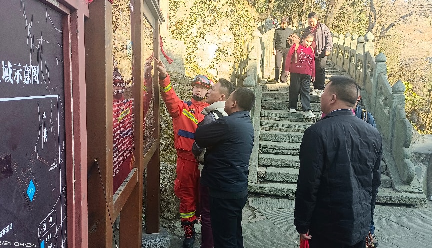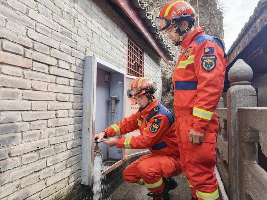 武当山消防救援大队积极巡检备勤,全力守护景区安全,并主动为游客提供旅游咨询等便民服务。(通讯员 谢飞 摄)