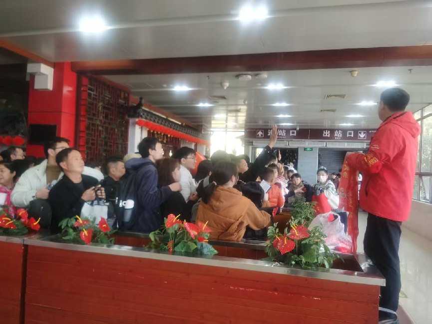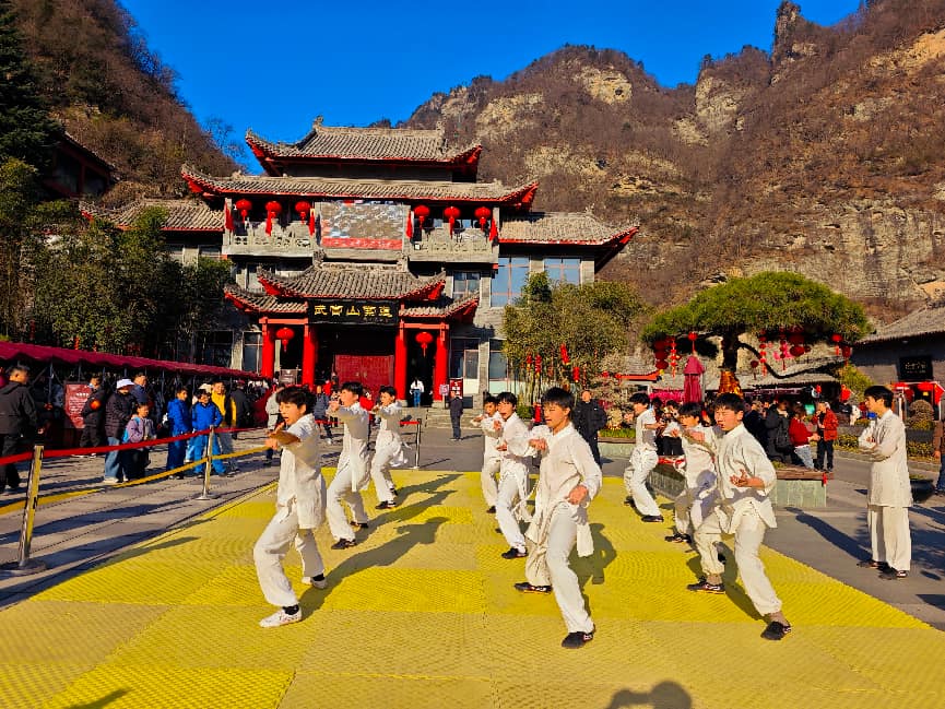 索道大厅前广场上,精彩的武当武术表演轮番上演。候车大厅二楼,趣味有奖知识问答与免费矿泉水赠送活动同步开展,贴心又热闹,丰富游客体验。(通讯员 沈萍 摄)