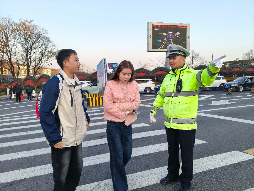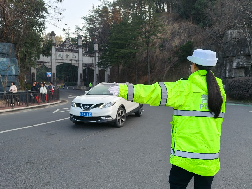 武当交警在山门口引导车辆有序进入停车场,并为游客提供咨询服务。(武当融媒记者 柴建 摄)