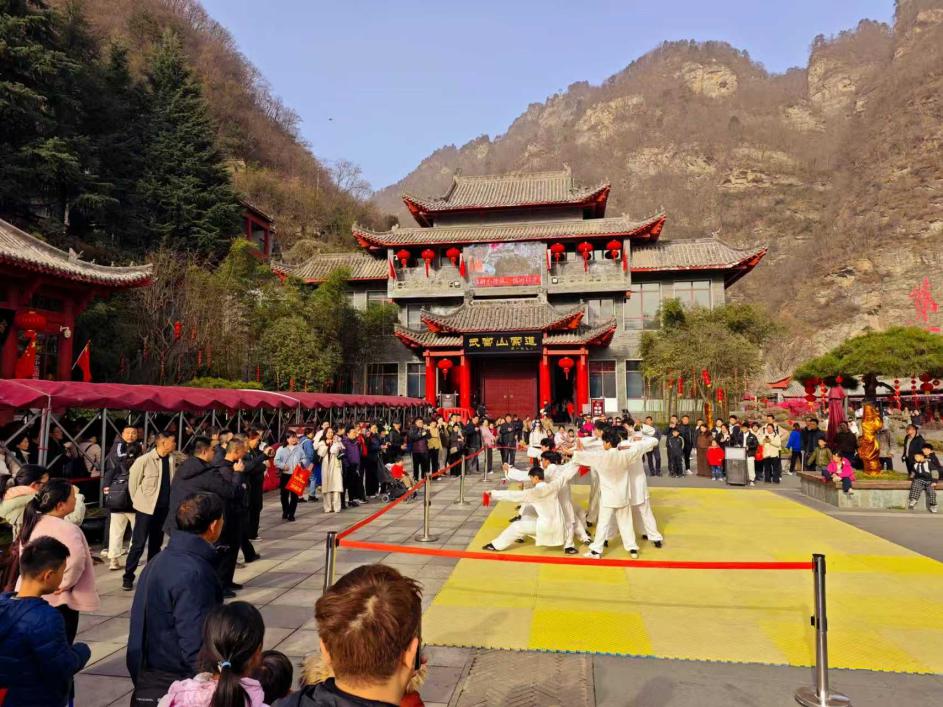 索道广场武术表演吸引游客驻足观看,掌声不断。(通讯员 沈萍摄)