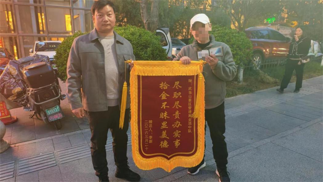今年春节期间,武当山景区迎来旅游高峰之际,金顶八卦台执勤的“小红帽”捡到一个装有身份证和多张银行卡的卡包。金顶中队队长王明俊迅速联动紫霄派出所,通过公安系统核查信息,第一时间联系上失主。经了解,失主为唇腭裂残疾人,卡内钱款是其全部积蓄。工作人员专程驱车从金顶前往十堰,将卡包亲手交还,解了失主燃眉之急。近日,这位游客专程将印有“尽职尽责办实事 拾金不昧显美德”的锦旗送至金顶中队。