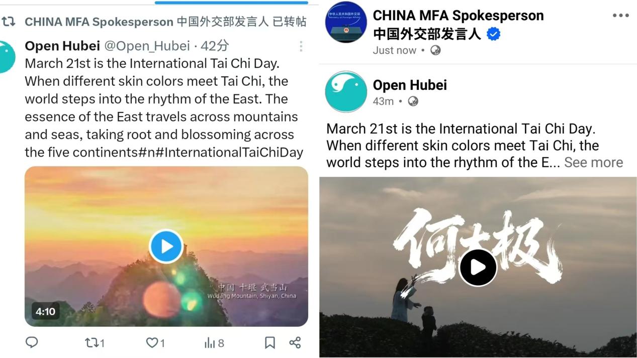 (中国外交部发言人海外官方账号转发Open Hubei发布的“国际太极日”全球宣传片。)